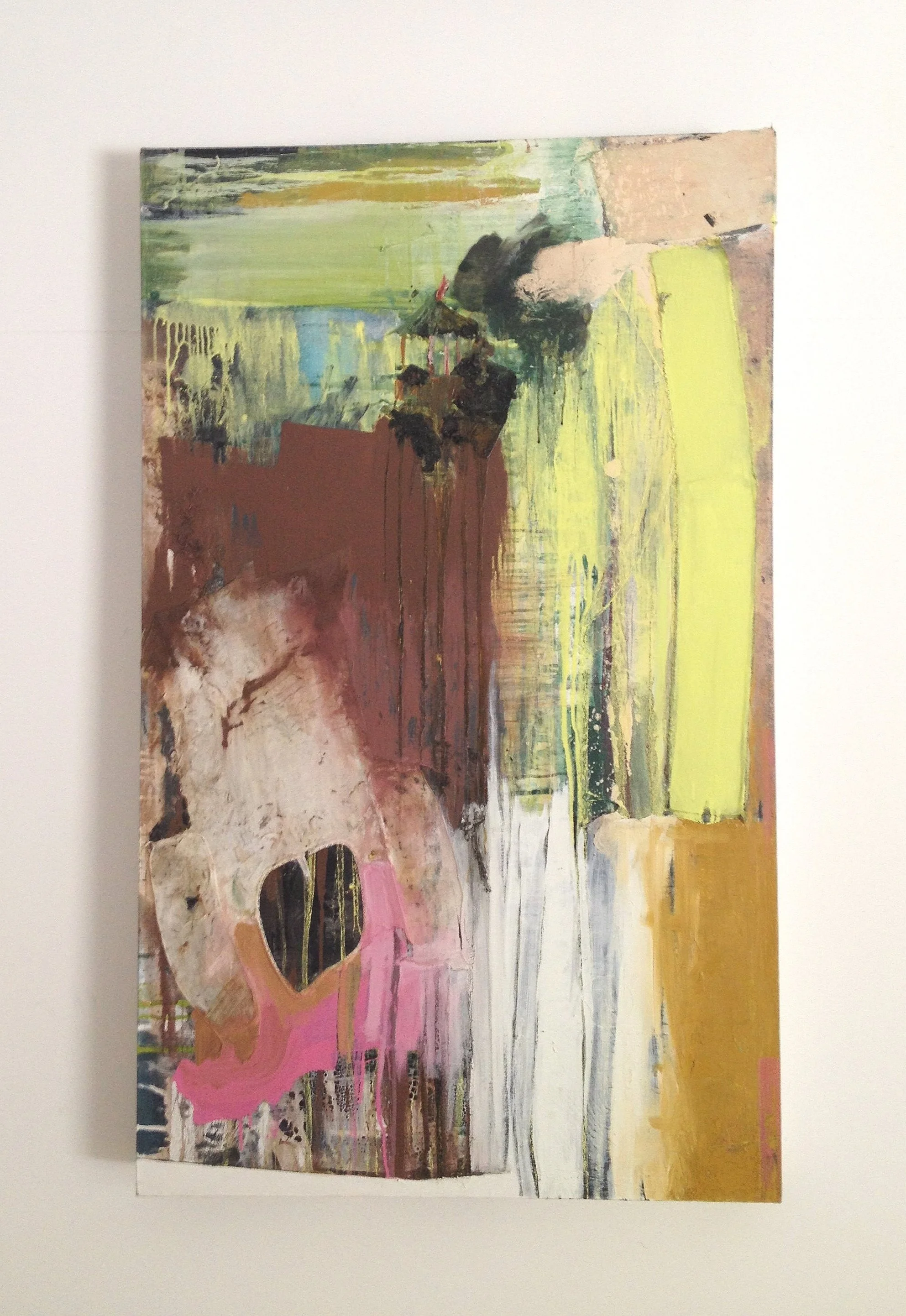 Oil acrylic, latex, enamel, canvas, metal lid on canvas
